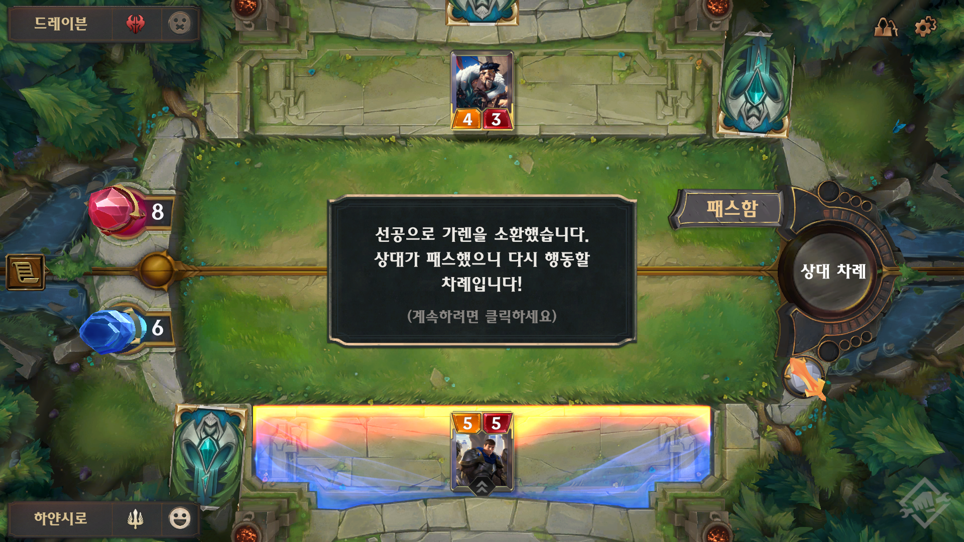 왼쪽편의 넥서스가 체력입니다. 게임의 구조자체는 돌겜과 비슷합니다.